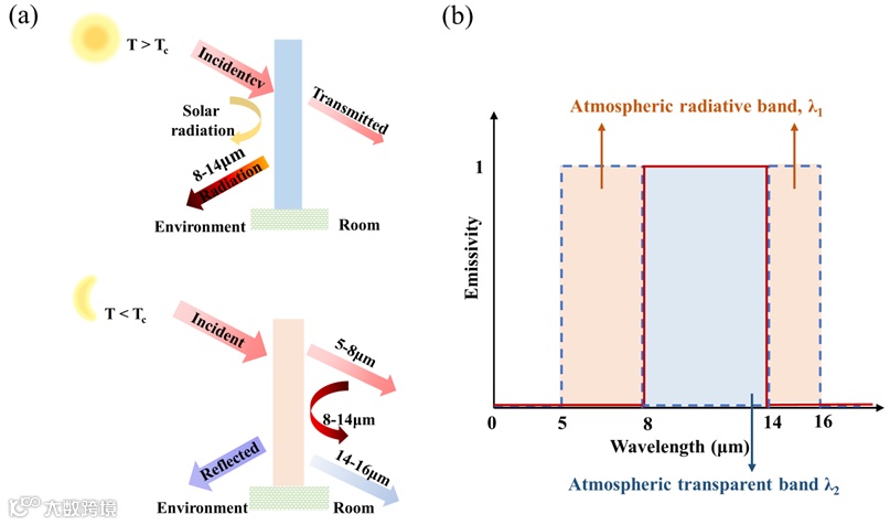 图1 温度自适应选择性发射器的运行机制。(a)内部、外部空间和结构表面之间的辐射热交换示意图;(b)不同状态下结构的理想光学光谱发射率。