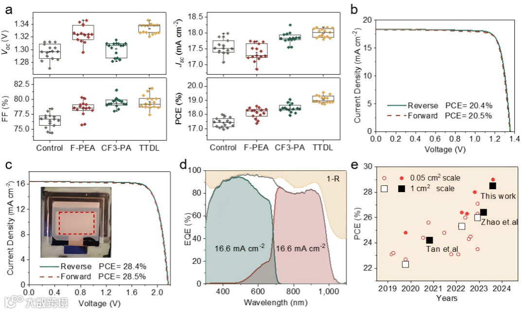 研究团队进一步地将优化后的宽带隙钙钛矿用于制备全钙钛矿叠层太阳电池。在活性区域为1.05 cm²的全钙钛矿叠层太阳电池中,实现了28.5%的转化效率(如图3c所示)。EQE显示的匹配电流为16.6 mA cm⁻²,与当前最佳的小面积全钙钛矿叠层太阳电池的数值相当,意味着在面积扩大时没有发生明显的电流损失(如图3d所示)。
