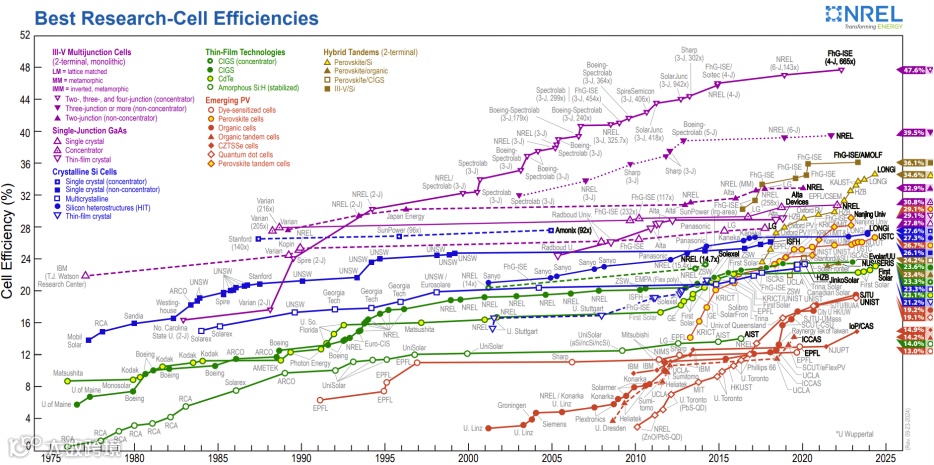 图5 | 美国国家可再生能源实验室发布的「最佳太阳电池效率」表。