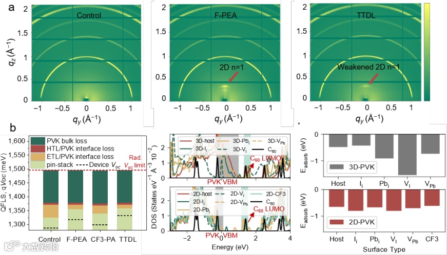 图2 | 定制的二维钙钛矿的作用机制。a, 不同后处理分子的钙钛矿表面GI-WAXs图谱;b, 含有不同插入层的钙钛矿堆叠中的性能损失分析;c, 二维钙钛矿与三维钙钛矿表面的能级分析;d, 含不同点缺陷的二维钙钛矿与三维钙钛矿表面与C₆₀的吸附能分析。