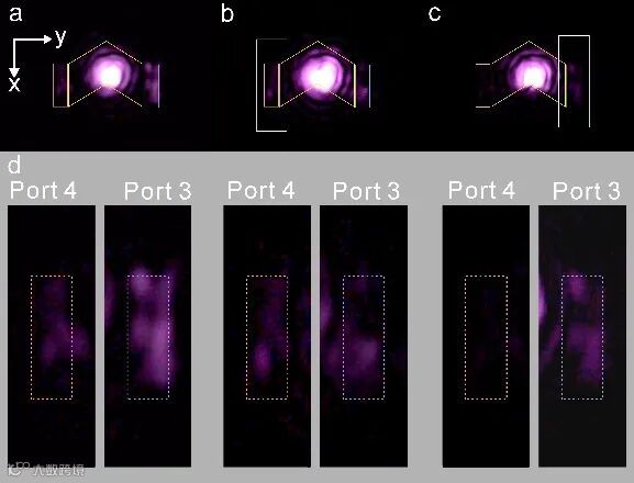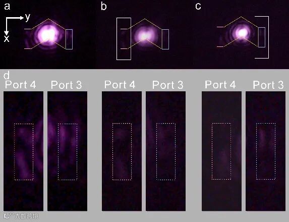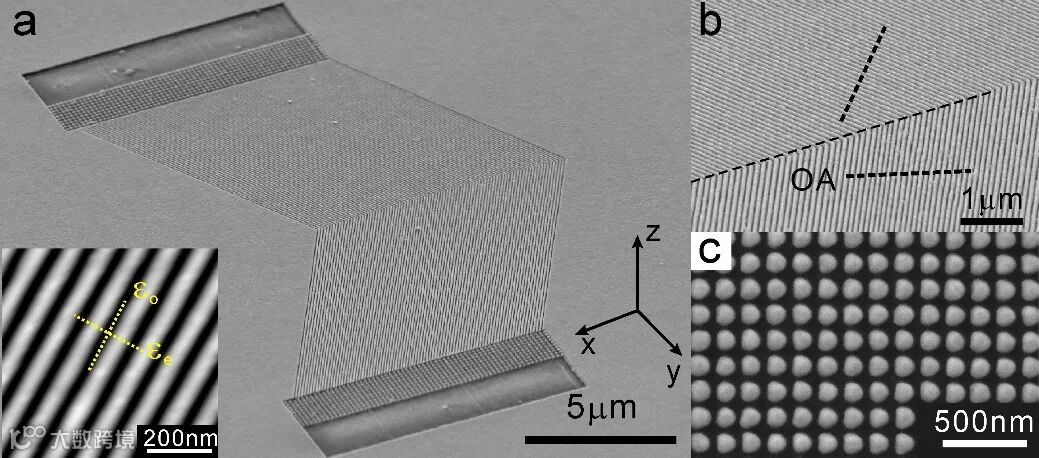基于上述设计,研究者通过聚焦离子束在60nm银膜表面进行刻蚀,制备对称取向的银条阵列,作为孪晶双曲超材料薄膜(图2)。测试过程中,808nm线偏入射光所包含的左、右旋信号分别进入1、4 信道与2、3 信道,并在3、4号端口出射至自由空间中,并恢复其左、右旋偏振。