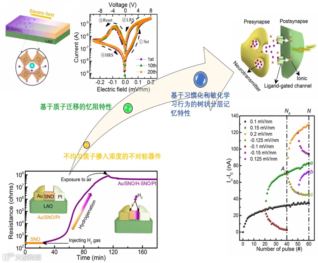 针对人工突触器件稳定性和未来大规模集成的需求,该研究团队在离子电子学人工神经突触器件方面展开深入系统的研究,打破传统器件依赖材料均匀性的制备思路,构建不对称器件(Au/SmNiO3/Pt),通过室温下的贵金属催化掺氢实现了质子在关联电子氧化物SmNiO3中的不均匀预掺入,并从原子尺度晶格结构和能带空间电子态结构角度出发,详细研究了该体系中质子-晶格-电荷之间的耦合机制。低的扩散势垒使得质子可以在超低电场下实现迁移,从而改变不均匀预掺入质子的浓度分布,使得该不对称两端器件(Au/SmNiO3/H- SmNiO3/Pt)表现出可靠且可逆的忆阻行为。原位表征技术和理论计算表明该行为来自于质子耦合电子转移效应控制的局域Mott跃迁。利用电脉冲对质子空间浓度变化的有效控制,可有效实现对生物突触中信息处理和记忆的动态过程的模拟,并进一步构建基于习惯化和敏化学习行为的树状分层记忆特性。这种通过质子重新分布修饰局部电子结构的类似方法可以拓展到其他关联氧化物量子材料中,并可用于设计具有高集成度、多功能和低能耗的智能设备和神经形态电路。