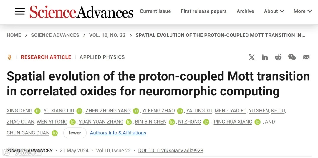 研究成果以“Spatial evolution of the proton-coupled Mott transition in correlated oxides for neuromorphic computing”为题,于2024年5月31日在 Science Advances 期刊上在线发表。华东师范大学为第一完成单位,上海市“超级博士后”邓兴、博士研究生刘雨翔和青年研究员杨振中为论文的共同第一作者,向平华教授、钟妮教授和段纯刚教授为论文通讯作者。