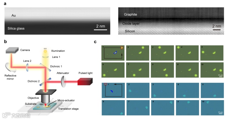 图1. 驱动体系与效果。a.具有范德华接触的材料-衬底界;b. 实现驱动的实验装置示意图;c. 金片与多层石墨的驱动效果
