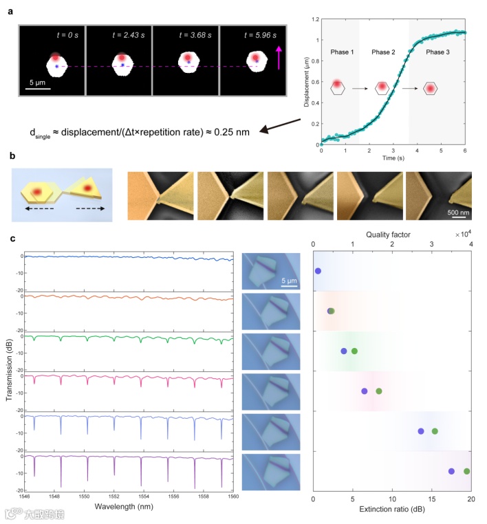 这项技术的一大优点在于,输入的光脉冲产生的运动在脉冲间相互独立,材料运动的速度也可以通过脉冲激光的重复频率来调控。通过视频图像分析,研究人员发现光-热-弹性波机理产生的运动具有亚纳米级别的精度,对应单个脉冲产生的位移大小(图3a)。利用这项技术,研究人员制备了可重构的等离激元狭缝型纳米天线。其中,两个金片之间的狭缝大小可利用脉冲激光调控,目前实现的调控精度可以达到纳米量级(图3b)。另外,将一片石墨微米片转移到集成光学器件上(这里展示的案例是微环谐振腔),研究人员可以通过操控石墨片与环形光波导的相对距离来调控谐振腔的损耗,从而对谐振腔的透射光谱进行调制(图3c)。根据此方法,光谱的消光比和Q值可以在很大范围内发生可重构的变化,甚至改变谐振腔的“开”、“关”状态。