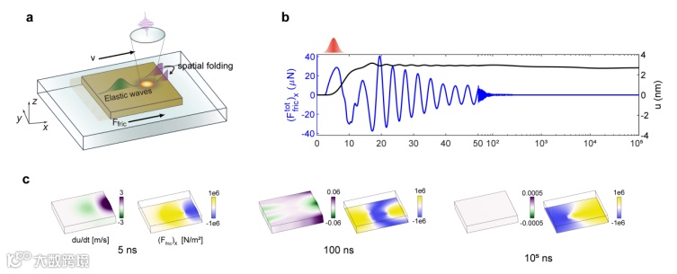 图2. 光-热-弹性波驱动机制。a. 光、热、弹性波相互作用的示意图;b. 材料受到的摩擦力合力与质心运动随时间变化的关系;c. 弹性波和摩擦力在范德华接触界面上的分布图