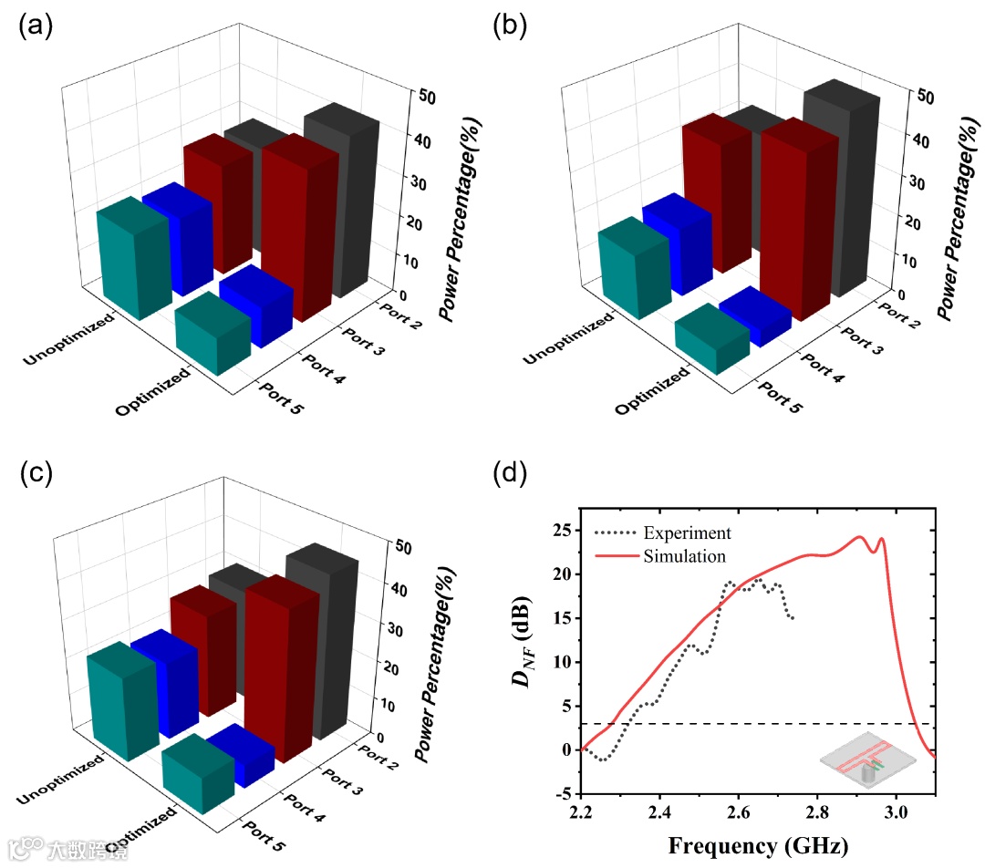 图4. 实验结果。所选三个频点下的待优化的以及优化的Janus天线的端口能量分布,优化的Janus天线的近场方向性曲线。