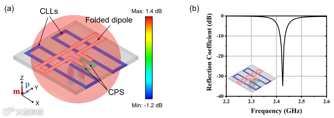 图2. Janus 天线(准各向同性电小天线)的示意图以及反射系数。