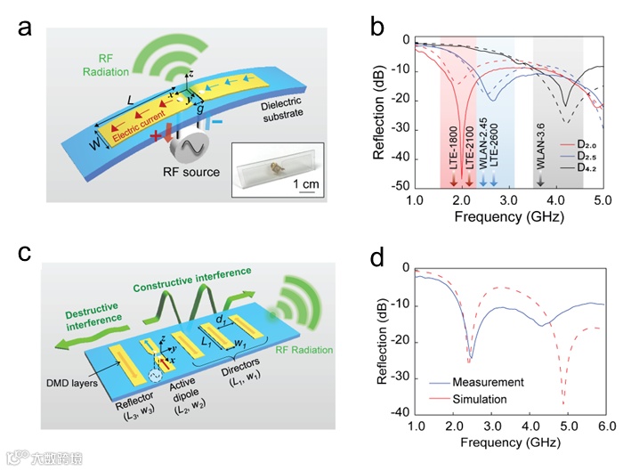 研究团队利用该透明柔性纳米复合材料,研发了工作在第四代长期演进(4G-LTE,1.7 GHz和1.9 GHz)、蓝牙(2.4 GHz)和Wi-Fi(2.4 GHz和5.9 GHz)频段的多种代表性OTA,包括半波偶极天线(全向天线),八木和贴片天线(单向天线),以及基于法布里-珀罗结构的超构表面。其中,半波偶极天线通过调节臂长实现了2.0 GHz、2.5 GHz和4.2 GHz的工作频率。测量的反射频谱与模拟结果一致,带宽分别为0.82±0.02 GHz、0.77±0.04 GHz和0.91±0.04 GHz,回波损耗超过10 dB。天线增益与银墨、铜浆制成的偶极天线相似,优于已报道的透明偶极天线。短波通信和广播的八木天线的中心频率为2.5 GHz,反射频谱带宽为0.87±0.05 GHz,最大增益为2.9±0.32 dBi。与全向偶极天线相比,八木天线在工作频段内具有更高的方向性和增益。