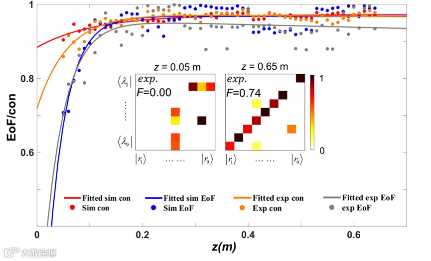 图2. 电磁涡环空时不可分离性随传播距离的演化:包括相干度(con)和纠缠度量(EoF)。相干度和纠缠度量随着距离迅速增加并保持在0.9以上,且插入的状态层析矩阵随传播逐渐对角化,表明生成的脉冲在传播过程中向更强的空时不可分离性演变,并更接近经典Hellwarth-Nouchi脉冲。