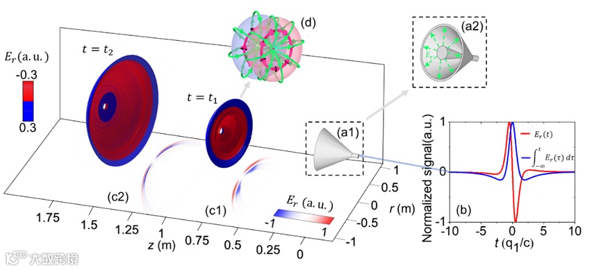 图1. 由同轴喇叭生成电磁涡环:(a)同轴喇叭天线,前视图 (a1) 和后视图 (a2);(b) 馈电信号;(c) 电磁涡环的时空演化:(c1) 和(c2) 是在不同时间点电场的空间等值面;(d) 电磁涡环的结构示意图。