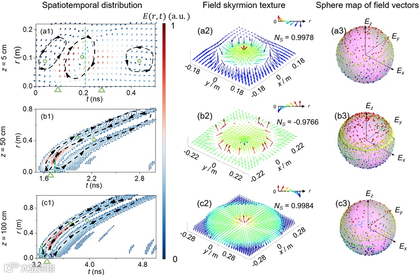 图3. 实测空时分布的矢量场:图(a1) 、(b1)和(c1)中的绿色三角形和圆圈分别标记了鞍点和涡旋环的位置;图(a1)、(b1)和(c1)中的绿色虚线分别表示在xy平面上特定时间的斯格明子纹理位置,如图(a2)、(b2)和(c2)所示。在(a3)、(b3)和(c3)中,矢量场的球面覆盖范围分别对应于(a2)、(b2)和(c2)中的斯格明子纹理,覆盖了球面的表面,确认了电磁空时斯格明子的存在。