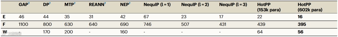 表1:碳数据集中HotPP与常见机器学习力场精度比较。