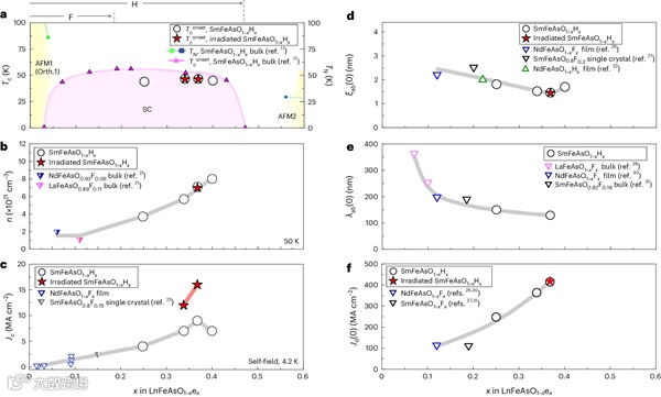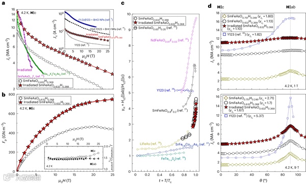 图5 原始和辐照SmFeAsO0.632H0.368样品的场内超导性能 © 2024 Springer Nature
