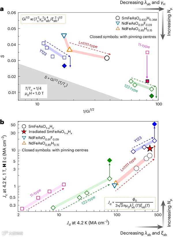 综上,研究人员采用了一种组合方法,通过调控载流子密度来控制λ和ξ从而调谐Jd,并通过辐照来增强磁通钉扎,大幅提高了SmFeAsO1-xHx薄膜中的Jc。制备的薄膜显示出铁基超导体中非常高的场内Jc值。就Y123而言,据报道在3 T磁场中的Jd值为15%,而在自磁场中的Jd值为32.4%,接近堆芯钉扎可实现的预测最大值。因此,本研究取得的415 MA cm-2的显著高Jd为SmFeAsO1-xHx薄膜中的Jc设定了新的上限。本研究的方法还降低了有效质量各向异性γ和Gi,从而减缓了涡旋蠕变。本研究证明了这种组合方法可以有效地改善不同系列超导体的性能,包括掺空穴的铜氧化物(Y123)和铁基超导体。