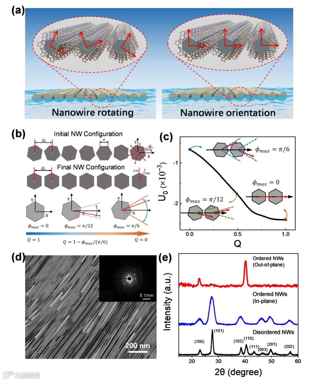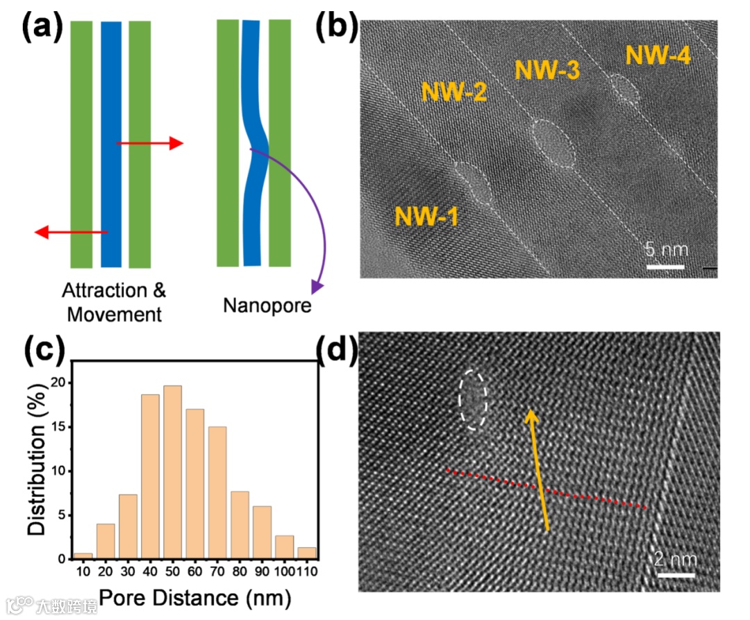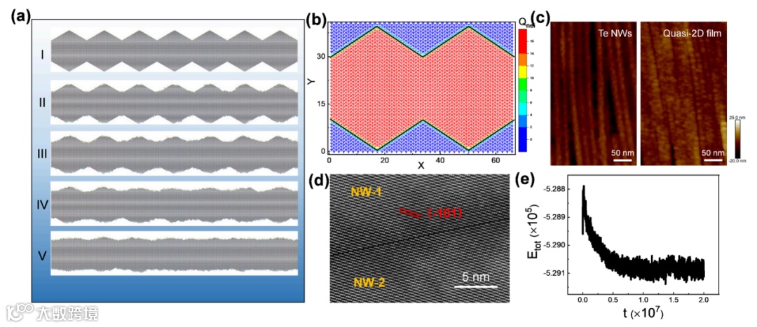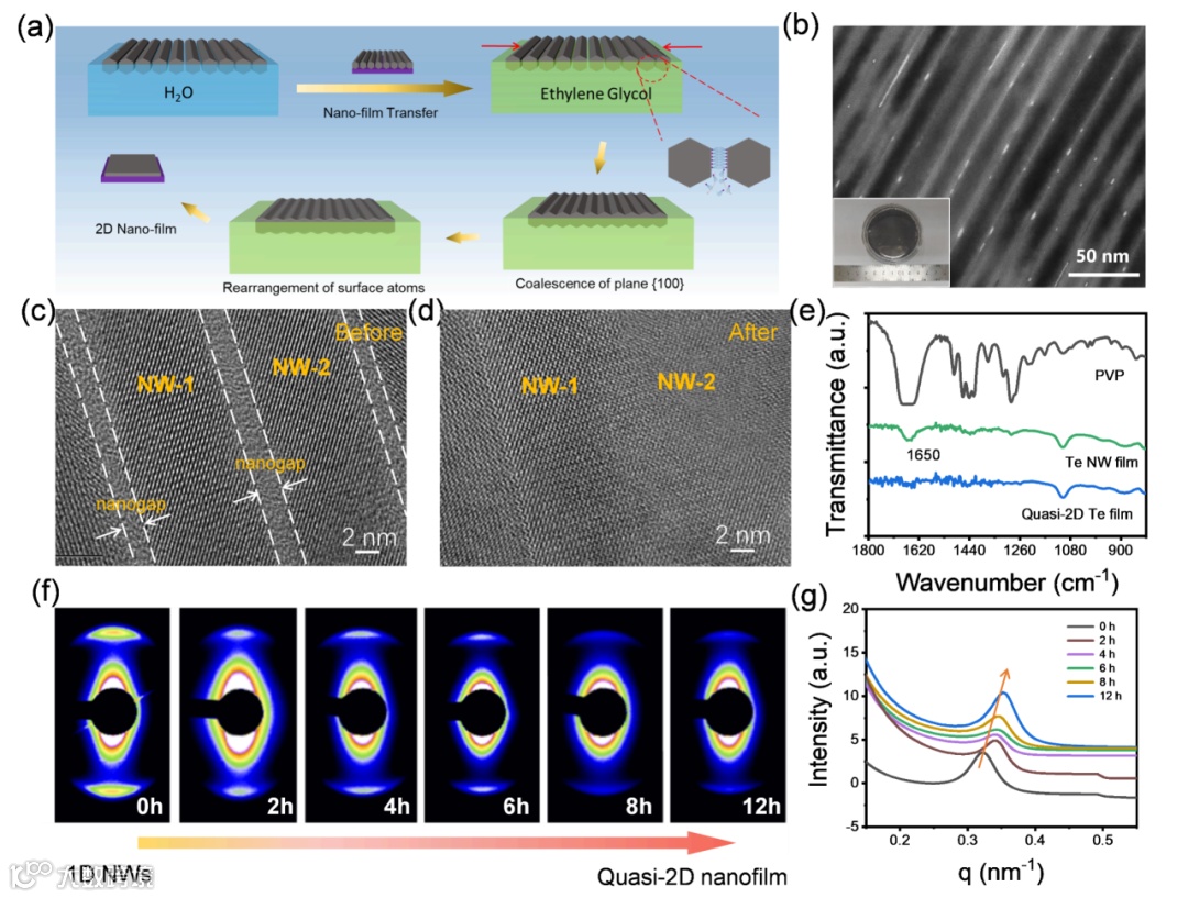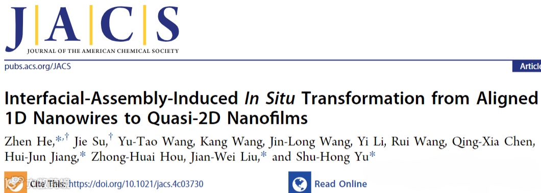 2024年6月12日,南方科技大学俞书宏院士和何振助理教授与中国科学技术大学刘建伟教授和江慧军副教授合作,报道了一种原位界面组装诱导合成的新策略,实现有序纳米线薄膜从一维到准二维结构的转变,揭示了其动态转变机制、界面合成动力学,为各向异性纳米基元构筑有序结构薄膜提供了新路径,相关论文以“Interfacial-Assembly-Induced In Situ Transformation from Aligned 1D Nanowires to Quasi-2D Nanofilms”为题发表在Journal of the American Chemical Society 上。何振助理教授为第一作者,俞书宏院士、何振助理教授、刘建伟教授、江慧军副教授为论文共同通讯作者,南方科技大学为论文第一单位和通讯单位。先进薄膜制造技术在现代智能电子工程中具有重要研究意义。在多种自下而上的薄膜制备策略中,基于界面组装方法构筑的具有大尺度有序排列结构的单层纳米基元薄膜,将带来新的性质或增强的性能。对于一维纳米结构而言,界面组装会导致结构取向,从而有效实现各向异性的光、电、热传导等特性。随着纳米组装体的发展,纳米基元之间的缺陷、晶体取向和均匀性等问题限制了有序薄膜的性能及应用。基于此,研究团队发展了一种原位界面组装诱导界面合成(IAIS)策略,通过有序一维碲纳米线的取向搭接,可控地制备出厘米级准二维碲纳米薄膜。研究发现,有序的晶体取向和表面活性剂脱附对跨维的转化过程至关重要。理论模拟表明,气液界面上的纳米线因弱相互作用力趋向于保持最低的自由能,晶面(110)取向搭接形成准2D纳米膜,揭示了1D到2D转变的生长途径。图1. 纳米线的界面取向过程。在纳米线的有序化过程中,研究人员引入Q=1-Φmax/(π/6)来描述纳米线晶面有序性(图1),其中Q=1代表纳米线呈面对面排列。研究发现,当纳米线处于“肩并肩”排列时,体系的平均自由能最高;当纳米线处于“面对面”排列时,体系的平均自由能最低。因此,在稳定的界面单层纳米线趋向于“面对面”排列。此外,相比于无序纳米线薄膜,有序纳米线薄膜的面外XRD图谱仅展现(100)和(110)的衍射峰。同时,面内XRD图谱则展现 (101) 、(202)、(102)和(003)等峰。(110)峰的消失初步证实了(100)晶面的搭接,即纳米线的“面对面”排列。图2. (a)纳米线的取向与搭接过程;(b) 准二维结构纳米薄膜电镜图;(c-d)搭接前后HRTEM图证实纳米线间隙的消失;(e)纳米线薄膜的红外光谱图;(f-g)同步辐射小角X射线散射表征结果。尽管成功制备了具有晶面取向特征的纳米线有序薄膜,但纳米线之间仍然存在2nm宽的间隙,不利于纳米薄膜的结构和性能。为了消除纳米间隙,需要进一步消除吸附在表面的表活剂,以实现纳米线的搭接。基于此,研究团队设计了界面合成新方法,通过将有序纳米线薄膜转移到高沸点溶剂界面,结合纳米线的搭接过程,成功制备了准二维结构的纳米薄膜(图2)。研究表明,高温界面有利于表面活性剂的脱附,且有利于表面原子的重排。电镜结果表明纳米线间隙初步消失。同步辐射小角X射线散射证实了各向异性长程有序性降低以及纳米线周期减小。沿有序方向的散射信号在散射矢量q=0.32 nm-1处显示峰值,并逐渐增加到q=0.35 nm-1,这表明纳米线平均有序周期减少了9%。在初始阶段所有纳米线以相同的分离距离平行排列;随着时间的增加,由于热噪声的存在,分子布朗运动的加速,使得纳米线间产生较大的相互吸引作用,导致纳米线之间的振荡和碰撞。最后,随着反应时间的延长,纳米线片段的碰撞点会聚在一起并逐渐融合聚集形成纳米薄膜。图3. 有序纳米线的界面取向搭接过程。为了进一步研究跨尺度转变机制,研究团队对纳米线搭接过程进行了分子动力学模拟。首先,选取40个纳米线阵列,相邻纳米线之间相隔固定距离ΔL作为初始状态(图3)。在初始状态下,纳米线表面活性剂导致的体积-排斥相互作用与纳米线晶面之间的吸引相互作用平衡。当纳米线阵列转移到乙二醇表面且保持在高温条件下时,表面活性剂易于溶解在乙二醇中,导致纳米线之间的平衡距离随着时间的增加而越来越短,最终形成搭接的准2D纳米薄膜。图4. 纳米薄膜孔缺陷的形成与表面原子的应力扭曲。由于纳米线之间的吸引力相互作用随着分离距离的减小而变得更加强大,蓝色纳米线的底部和顶部将附着在其左侧邻近纳米线上,而中间部分将附着在右侧邻近纳米线上,形成三个搭接点并进一步导致纳米孔。由于高长径比,在纳米线边界上会同时形成大量的搭接点,不可避免地会产生许多纳米孔,并形成搭接界面的应力。通过原子尺度的蒙特卡罗模拟,具有小尺寸的纳米孔因缺失的原子较少而最终闭合。大尺寸的纳米孔因缺少较多原子最终无法闭合。图5. 纳米薄膜表面原子的动态演变。当纳米线取向搭接时,纳米线表面较少表面活性剂导致纳米膜表面原子的不稳定状态。而纳米薄膜顶部Te原子因势能差会产生不稳定扰动,最终导致表面原子在能量最小原则下的重新排列。研究团队采用蒙特卡罗(MC)模拟来研究纳米薄膜表面原子的重排过程。随着反应时间的增加,Te原子从凸边界的位置移动到凹边界的位置,使得六边形纳米线变得越来越平坦。由于纳米线内部被占据位置的能量低于边界上位置的能力,Te原子倾向于具有较小的表面体积比的构型,以获得较低的总能量。扫描透射电子显微镜(STEM)图像证实了Te 纳米薄膜良好的附着边缘。单层碲纳米薄膜微观取向结构