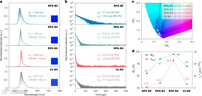 图2:DPA-B2 、 DPA-B3 、 DPA-B4和Cz-B4的光物理性质。