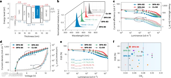 图3:基于DPA-B2 、 DPA-B3 、 DPA-B4和Cz-B4的非敏化OLED的EL性能。