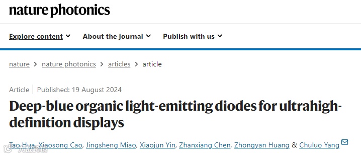 Hua, T., Cao, X., Miao, J. et al. Deep-blue organic light-emitting diodes for ultrahigh-definition displays. Nat. Photon. (2024).