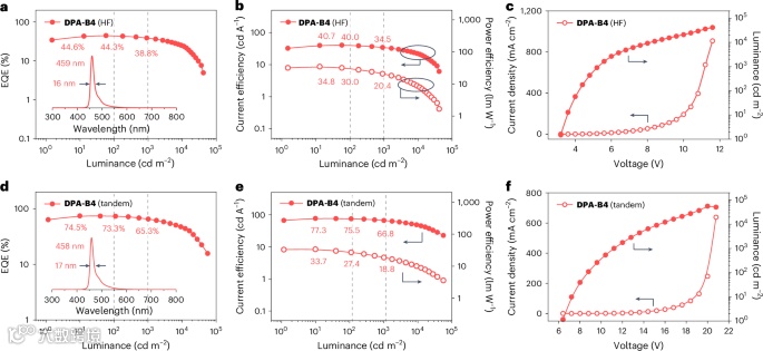 图4: 基于 DPA-B4 的 HF 器件和两单元串联 HF 器件的 EL 性能。
