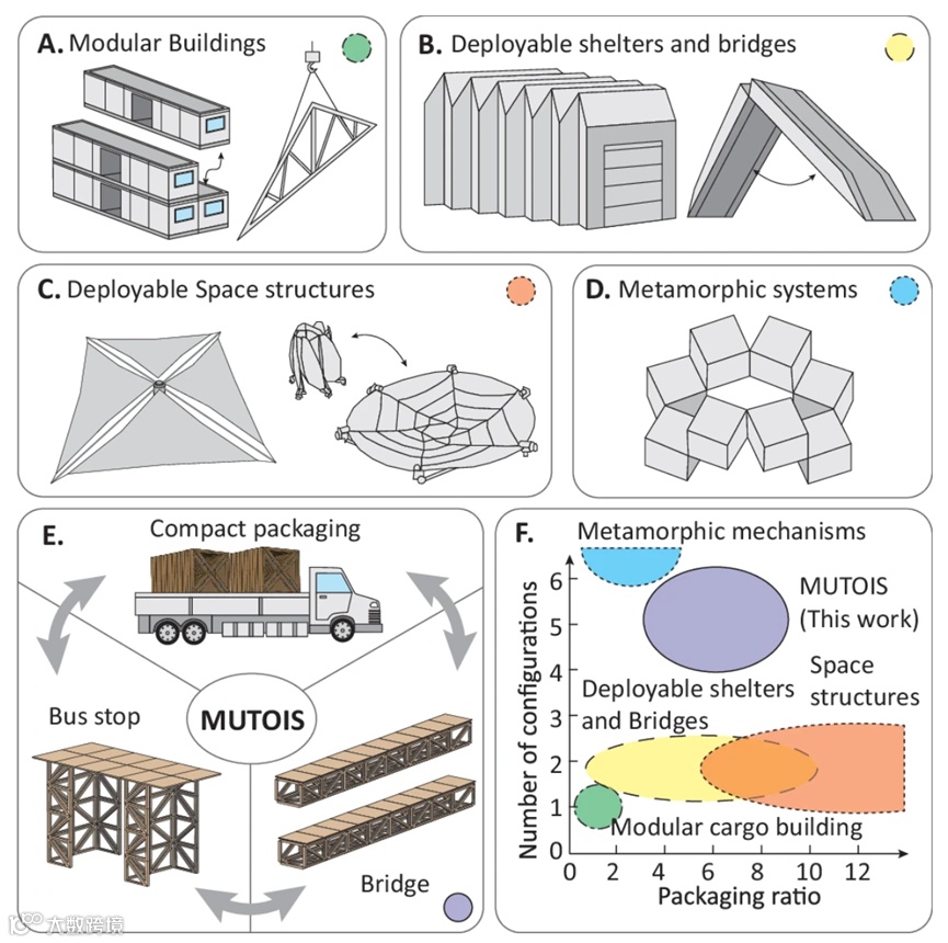 近日,密歇根大学的Yi Zhu和Evgueni T. Filipov开发了一种模块化且均一厚度的折纸结构(MUTOIS),它能够被快速部署,可实现多形状、多功能的配置以适应不同的需求。相关研究人员首先推导了N级折纸顶点可平折、可展开和均匀厚度的一般条件。同时,相关研究人员制造了米级结构原型,表明这些折纸结构可以利用局部和全局的模块化来实现形状和功能的强适应性;利用多路径折叠运动在存储状态和结构状态之间进行适当的再配置;利用均匀的折纸单元厚度来实现大负载。MUTOIS结构为设计大尺寸、适应性强、可部署和大承载的结构提供了新思路,可以改变传统土木工程的建筑路径,可能在航空航天系统、地外栖息地、机器人等领域进行更广泛的应用。