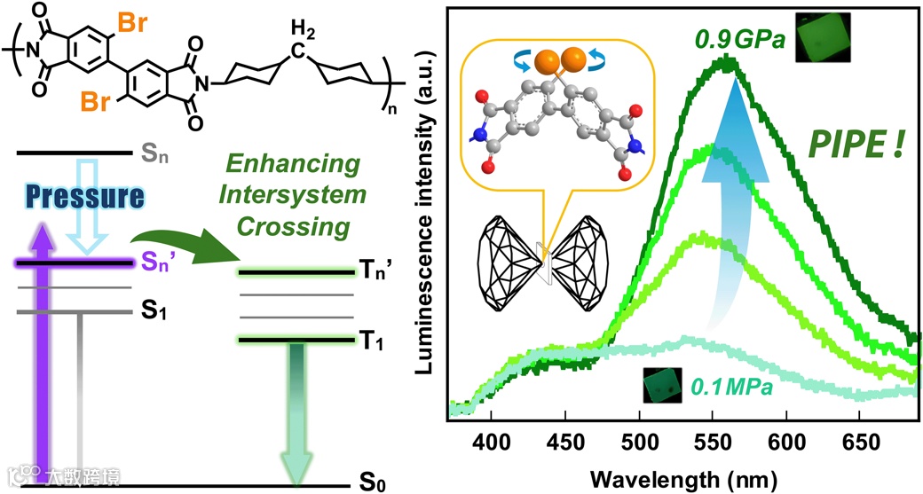 在材料科学领域,高分子聚集态对材料的光物理、机械和化学性能具有至关重要的影响。这些性能决定了高分子材料在电子、光学和生物医学等领域的应用潜力。为了研究荧光和磷光的双发光聚酰亚胺(PI)的聚集状态与光致发光机制之间的相关性,东京工业大学的安藤慎治(Shinji Ando)教授,刘浩男(Haonan Liu)助理教授和毕业生礒田隆一(Ryuichi Isoda)等人,使用金刚石压砧装置(DAC)在8 GPa的高压下,分析了荧光型BP-PI、磷光型DBrBP-PI(见图1)及其对应的酰亚胺模型化合物(BP-MC和DBrBP-MC,分散在PMMA薄膜中)的光物理过程。在365 nm激发下,DBrBP-PI在0.9 GPa的压力下观察到显著的压力诱导磷光增强(PIPE),这是有机聚合物中极为罕见的现象。研究成果以《Pressure-Induced Enhancement of Room-Temperature Phosphorescence in Heavy Halogen-Containing Imide and Polyimide》为题,于2024年7月25日(当地时间)在线发表于美国化学学会的《The Journal of Physical Chemistry B》期刊。