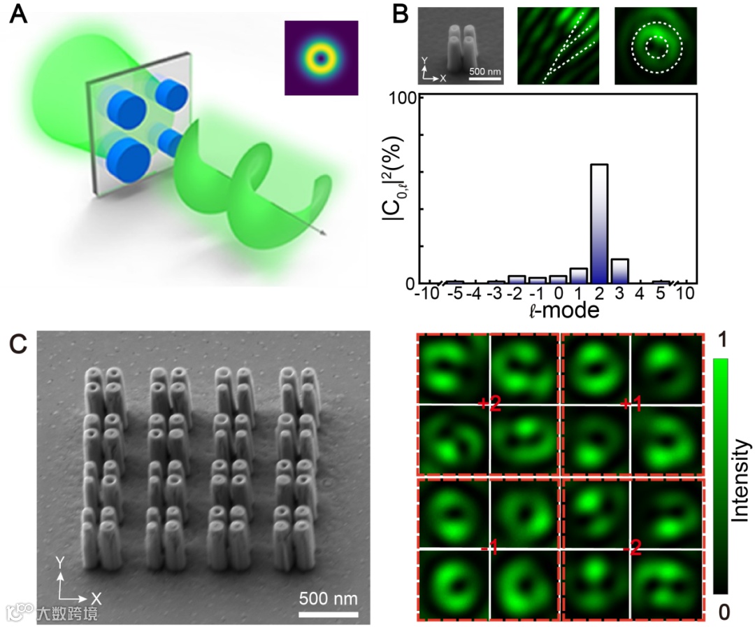 技术难点的突破需要原理创新。为了实现亚波长尺度的涡旋光超表面,研究团队对超表面传统设计方法做出了突破。在传统方法中,每个光学元原子都被独立对待,并刻意忽略了近场相互作用。因此,传统的微纳器件通常仅限于单像素级别的操作。肖淑敏和宋清海团队另辟蹊径,从近场模式相互作用出发,发现了光场调控的全新自由度:间隙相位。当一个由紧密排列的纳米柱构成的元胞被照射时,通过近场相互作用可以形成多种混合模式。当所有混合模式被激发并相互作用时,可以在纳米柱之间的间隙中生成相位梯度,并形成间隙相位。利用间隙相位提供的额外光场调控能力,使用仅包含4个纳米柱的超构四聚体就可以实现连续的涡旋相位。该工作在实验中实现并验证了具有高效率、高纯度、拓扑荷l=1-10的涡旋光束。