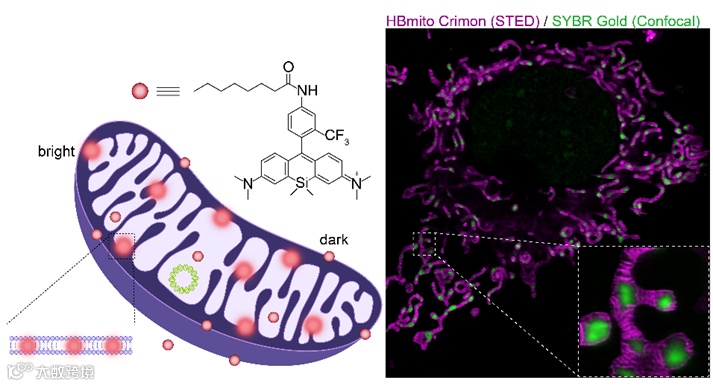 线粒体的直径一般在500纳米左右,嵴间距一般小于70纳米,传统显微镜技术没有办法观察到该动态过程。超分辨显微镜,特别是受激辐射损耗超分辨显微镜(STED)的发展,使得线粒体嵴的动态可视化成为可能,该技术提供的空间和时间分辨率分别约为50纳米和每秒1帧。然而,STED需要高强度的损耗光束来提升分辨率,要求标记染料在特异性靶向线粒体内膜的情况下,同时具有高亮度和高受激发射截面(即低饱和功率)的特点。传统的线粒体内膜标记染料在STED下只能维持几帧,新开发的一些染料在动态成像时间尺度上也满足不了观察需求。