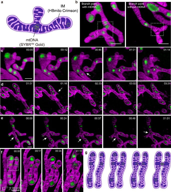 图2 与mtDNA相关的线粒体动力学成像。(a)卡通展示mtDNA倾向于分布在尖端和分支点;(b)分支点处存在mtDNA和不存在mtDNA时的情况;(c)线粒体融合形成分支点;(d)新分支的出现形成分支点;(e)线粒体分支上的mtDNA移动到分支点;(f,g)线粒体融合中的嵴动态展示。
