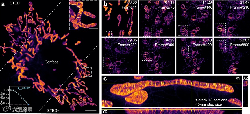 图1 用HBmito Crimson染色的线粒体内膜多维成像结果。(a)共聚焦,STED和STED反卷积结果对比展示;(b)线粒体连续长时程成像,成像帧数500帧;(c)线粒体的3D-STED成像。