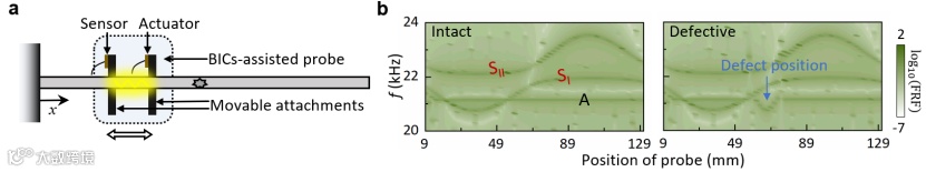 基于连续域束缚态的特殊响应,研究者还构想了一种用于检测结构损伤的探针(图4(a))。外附加的柱子与被测结构(悬臂梁)构造了多极化束缚态。通过沿着被测结构移动柱子并测量这些束缚态的频响变化,可以检测到可能存在的缺陷(图4(b))。相较于传统基于结构本身固有模式的无损检测方式,这种人为构造的局域模式使得能量更加集中,增加了缺陷与波的相互作用,因而具有更高的灵敏度。