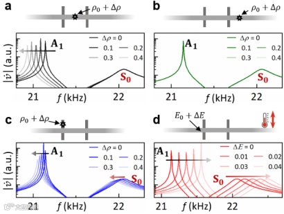 以上多极化束缚态对微扰的特殊响应无疑为探测与传感提供了新思路。例如,利用两种模式对柱子中间区域的微扰的差异化响应而对环境微扰的相同响应的特性,研究者提出了一个新的探测量,即两个模式共振频率之差。这个探测量可以免受环境因素(温度,预应力等等)的影响,有助于构造一种高性能且免校准的测量方案来应对复杂的工作环境。