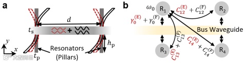 图1. 旁支两对共振柱的兰姆波波导。(a) 兰姆波波导示意图。它支持纵波(红虚线)和弯曲波(黑实线)。(b) 模型示意图。四个共振质子(R1、R2、R3和R4)通过波导相互耦合。简便起见,只画出了R1与其他质子的耦合。