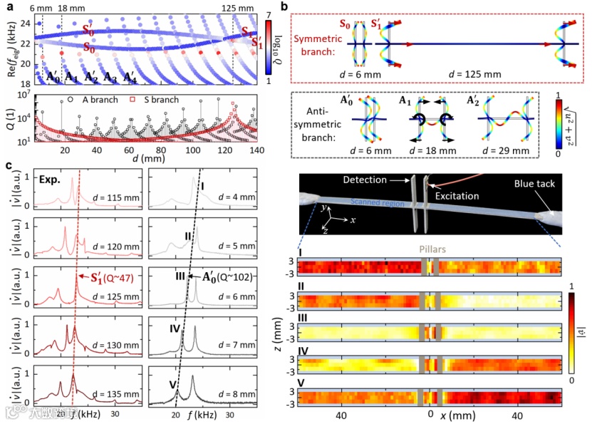 图2. 兰姆波波导中的连续域束缚态和准连续域束缚态。(a) 反对称和对称支上共振模式的共振频率(上)和品质因子(下)随柱子之间间距的变化曲线。(b) 相应连续域束缚态和准连续域束缚态的共振模式。(c) 测量得到的反对称和对称支上共振模式的频谱(左)与相应峰值附近的面外速度场(右)。