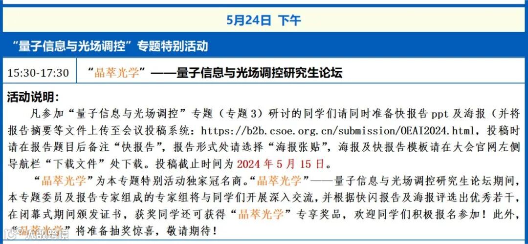 会议介绍:本专题研讨以线性及非线性光场调控为物理基础的量子信息研究前沿进展,特别是红外波段光量子调控的创新成果,包括但不限于:光学量子通信与量子计算技术的工程应用;新型非经典光场的制备、调控与表征;高维量子接口与量子存储的物理实现;新型量子传感与成像技术;非线性超结构与片上光量子调控技术;基于超表面及液晶几何相位原理的经典及量子光场调控技术。南京晶萃光学科技有限公司为本专题研讨会独家冠名商。