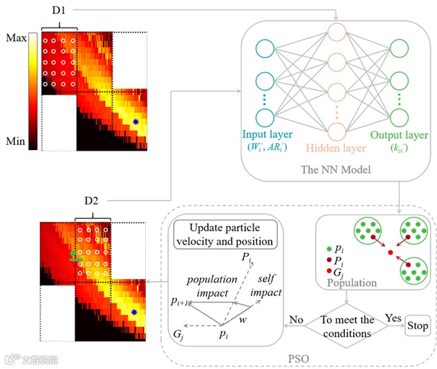 随后创建基于神经网络(NN)和粒子群优化(PSO)算法的深度学习模型(图3)。选取网格D1,在D1中等间隔选取Wi和ARi,计算得到相对应的kzi,得到训练集{(Wi, ARi, kzi), i = 1, 2, …, M}。将该训练集输入到NN,得到描述W、AR和kz之间映射关系的NN代理模型。在D1中随机选取Wi’和ARi’代入NN模型,快速预测相应的kzi’。这些kzi’被分组为初始种群,每个kzi’都有速度vi和位置pi (Wi’, ARi’)。vi决定了kzi’移动的速度,pi决定了kzi’移动的方向。计算每个kzi的适应度∆kzi,比较∆kzi以找到kzi’的最优解,即单个极值Pi。通过与总体共享Pi,可找到全局最优解Gj,其中j表示训练集数量。如果需求得到满足,迭代结束。否则,更新每个kzi’的vi和pi,进行下一次迭代,直到收敛于最优点。