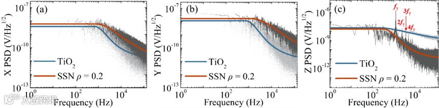 图6 SSN和TiO2颗粒在水环境中被捕获时的x- (a)、y- (b)和z- (c)方向的功率谱密度曲线。