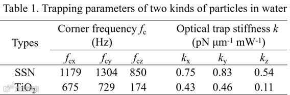 采用光镊实验系统测试了SSN光力探针的光阱增强性能,三轴的功率谱密度曲线如图6所示。实验研究表明,SSN光力探针的横向(kx和ky)和轴向(kz)光阱刚度是非晶型TiO2微球的2倍和5倍(表1)。实验还发现,SSN光力探针在光阱中心会绕光轴自转,自转频率fγ为1276 Hz(图6c)。此外,在自转频率的右侧,还包括三个明显的倍频峰,这说明颗粒做非简谐自转。