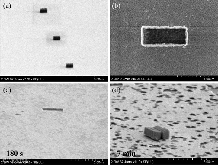 研究所人员以上述优化参数为参考,采用基于铬(Cr)牺牲层的自顶向下加工工艺制备了SSN光力探针。SSN光力探针以20 μm的间隙排列在Si基底表面的铬牺牲层上(图5a),单个SSN光力探针的宽度和长度分别为450 nm和1125 nm(图5b)。采用湿法刻蚀工艺从Si基底剥离SSN光力探针。在180s时,Cr牺牲层完全溶解,基底表面留下了SSN光力探针剥离的痕迹(图5c)。在7min时,SSN光力探针可以在Si基底表面自由移动,表明刻蚀完成(图5d)。