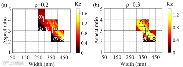 ρ = 0.2的寻优路径如图4a白色箭头所示,最优kz1’(图4a蓝点)为1.7 pN μm-1mW-1,对应的参数组合为W = 450 nm,H = 1125 nm,AR = 2.5。为了验证算法在极端条件下的适用性,研究人员还针对ρ = 0.3的情况(存在较多无法稳定捕获的参数点)进行了同步寻优计算。ρ = 0.3的寻优路径如图4b黑色箭头所示,最优kz2’(图4b蓝点)为1.6 pN μm-1mW-1,对应的参数组合为W = 383 nm,H = 1110.7 nm,AR = 2.9。