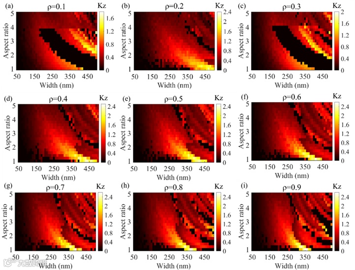 图2 不同ρ值下SSN光力探针的kz与W、AR之间的关系。 (a) ρ = 0.1 (b)ρ = 0.2 (c) ρ = 0.3 (d) ρ = 0.4 (e) ρ = 0.5 (f) ρ= 0.6 (g) ρ = 0.7 (h) ρ = 0.8 (i) ρ = 0.9。图中的黑色像素表示SSN纳米颗粒在该尺寸条件下,不能实现3D捕获。