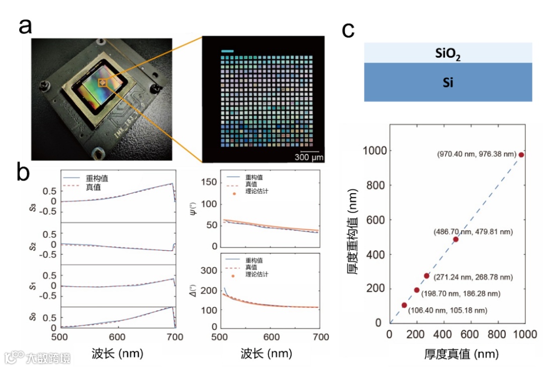 图2 (a)基于超构表面阵列的光谱偏振探测单元照片和超构表面阵列放大图。(b)100 nm的SiO2薄膜样品的全斯托克斯光谱和椭偏参数的重构结果与光谱仪测量真值的对比。(c)基于超构表面光谱椭偏仪测量得到的不同厚度SiO2薄膜的厚度重构值与真值的比较。