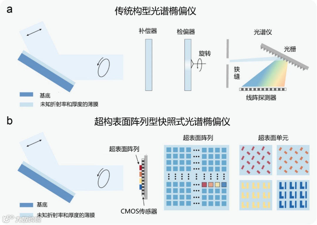 图1 传统构型光谱椭偏仪(a)和基于超构表面阵列的光谱椭偏仪(b)系统示意图
