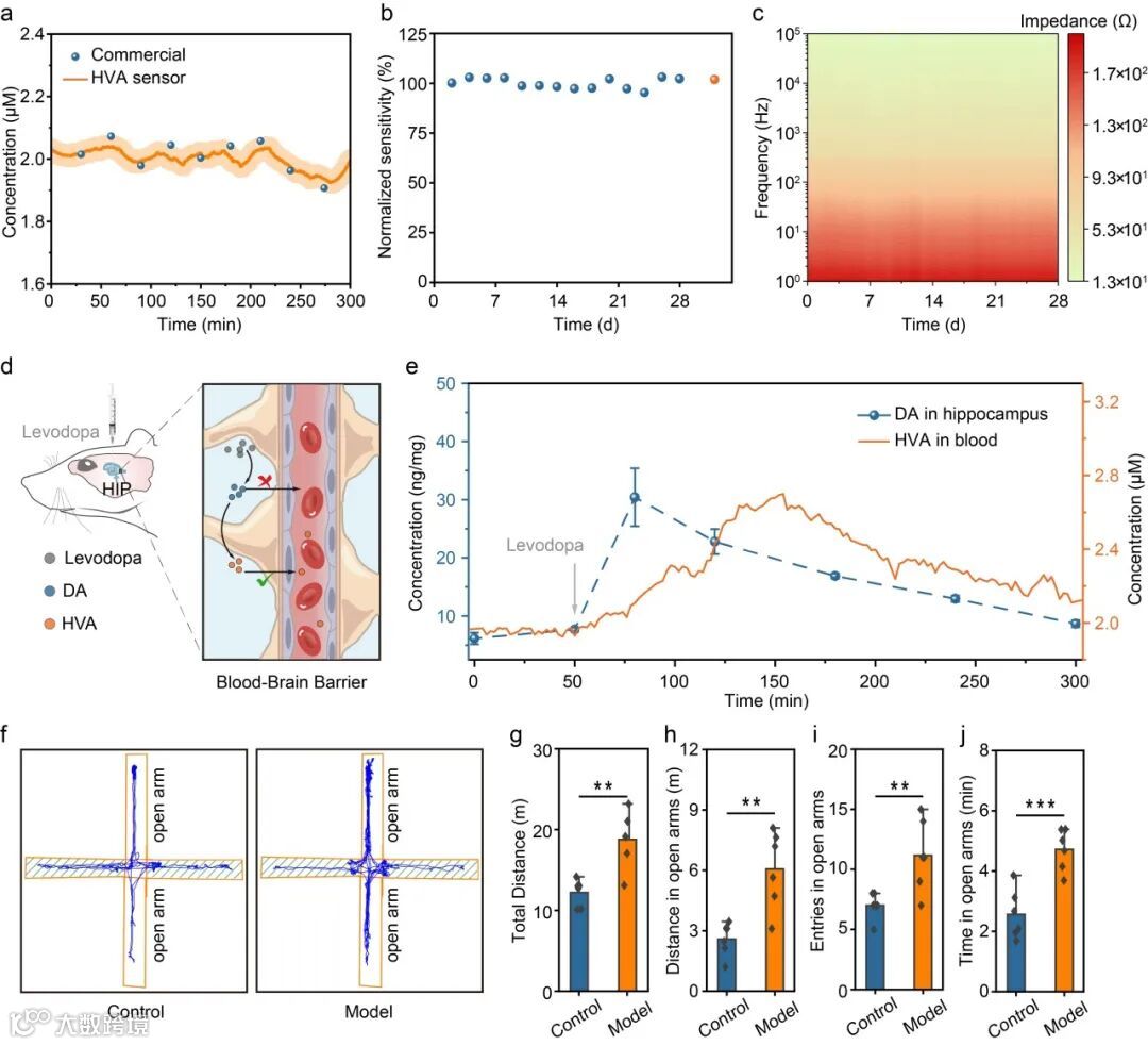 将高选择性纤维传感器微创注射至大鼠尾静脉,并与柔性芯片集成来评估传感器的在体响应性能。实验结果表明,传感器在体连续采集的数据与通过商用ELISA试剂盒取样测试结果十分匹配,准确率高达97.8%。传感器植入大鼠体内四周,期间传感器的灵敏度与界面阻抗均保持稳定,展示了传感器在体长期连续监测的可行性。得益于传感器优异性能,将其应用于中枢多巴胺活性的研究作为概念验证。将药物左旋多巴靶向注射至海马体来诱导颅内多巴胺的产生。植入大鼠尾静脉的纤维传感器实时监测到血液中HVA浓度逐渐增加,其在104分钟后达到峰值,与中枢多巴胺达到峰值相比延迟74分钟。此外,随着血液HVA浓度的增加,大鼠表现出兴奋性行为。该结果验证了通过传感器实时监测血液HVA来评估中枢多巴胺变化趋势和评价药物行为反应的可行性(图4)。