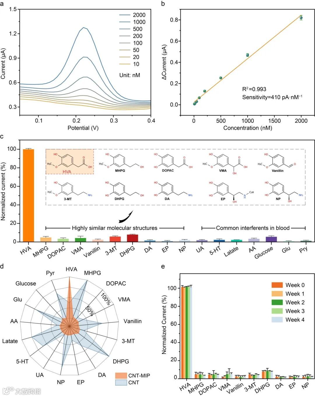 实现体内HVA实时监测的主要挑战在于血液中存在大量活性物质,尤其是HVA同类的儿茶酚胺及其代谢物,它们的分子结构与HVA非常相似,甚至只有一个官能团的差别。因此很难将它们与HVA区分开来,实现对血液HVA的准确监测。虽然目前临床上可通过高效液相色谱法或酶联免疫吸附法(ELISA)来检测血液中的HVA,但受限于采血频率和数量,以及需要在实验室对采集的样本进行长时间分析,实时监测HVA仍具有挑战性。因此,目前还没有方法可以实时监测血液HVA。