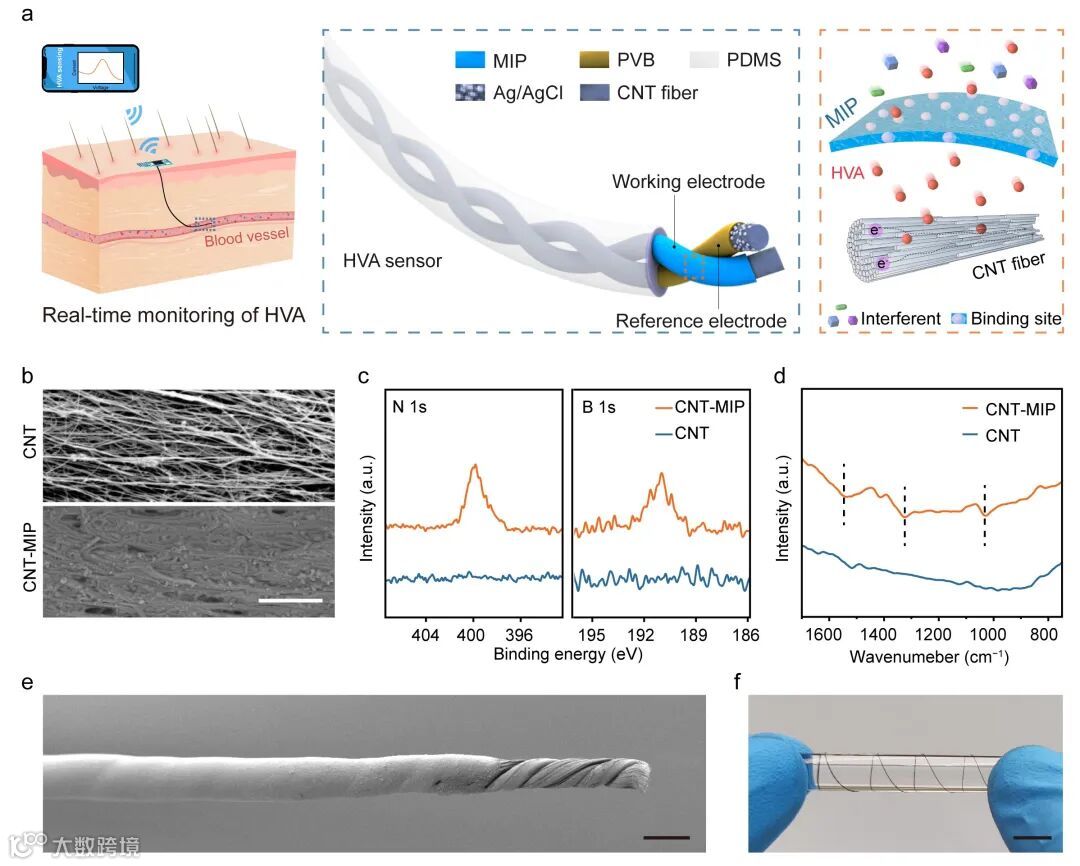 近日,南京大学张晔课题组开发设计了一种高选择性的植入式纤维传感器,用于实时监测血液高香草酸。通过设计分子印迹聚合物,传感器仅允许与识别位点精确匹配的分子通过,进而实现了对HVA高选择性响应。该传感器对HVA的响应是对儿茶酚胺及其代谢物响应的12.6倍,在体监测准确度达到97.8%。此外,还对传感器的生物相容性进行了评估,没有观察到明显的血栓、生物粘附或炎症。微创注射到大鼠尾静脉后,该传感器成功监测到了中枢多巴胺波动引起的血液HVA浓度的平行变化,并同时指示了大鼠的兴奋行为。成果近期以“A Highly Selective Implantable Electrochemical Fiber Sensor for Real-Time Monitoring of Blood Homovanillic Acid”为题发表在ACS Nano,DOI:10.1021/acsnano.3c11641。