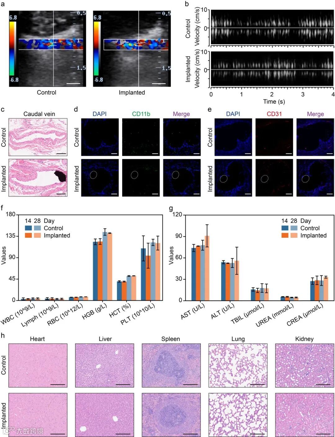研究人员进一步评估了高选择性纤维传感器的生物相容性。将传感器植入SD大鼠尾静脉四周后,植入位点血流超声和流速与对照组无显著性差异,该结果与植入位点的H&E染色切片共同表明传感器的植入未造成血栓。同时,抗体CD11b和CD31标记的免疫荧光染色切片进一步表明传感器的植入未造成显著的炎症细胞浸润和血管增殖。此外,通过血液分析和核心器官表征结果评估了纤维传感器的慢性毒性。上述结果表明,传感器表现出较高的血液相容性和生物安全性,满足在体连续监测的需求(图3)。
