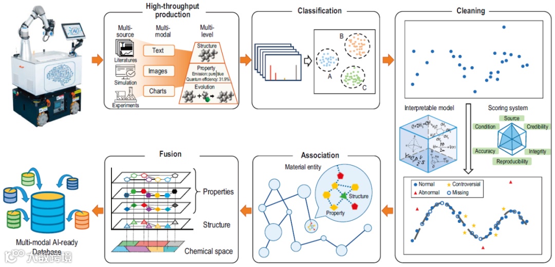 针对上述问题,中国科学技术大学江俊教授团队近期在《国家科学评论》(National Science Review,NSR) 发表观点论文,提出了利用机器化学家系统,将大规模数据挖掘、高性能计算模拟、高精准机器人实验三者结合,高效获取大规模标准统一、广泛覆盖的高质量科学数据,并自动化地检验数据,最终建立多模态数据库的方案。作者团队前期开发的机器化学家系统,能够自动检索和阅读化学文献、智能设计实验流程、执行模拟-合成-表征-测试的全流程实验。基于该系统,作者阐述了如何通过发展一系列人工智能模型,实现数据的自动化高通量生产、分类、清洗、关联和融合。