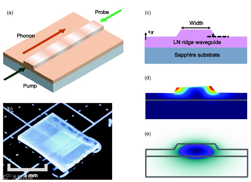 布里渊散射是电介质中最强的非线性光学效应之一,其为实现低噪声光学增益以及相干光子-声子互联提供了一种有效的方法。然而,以往对集成布里渊散射的研究主要局限于非约束声子或约束声子的悬空结构中。前者由于声子场功率密度低而很难实现高效的布里渊相互作用,而后者的悬空结构具有结构脆弱、制备难度和热效应明显等缺点。因此学界一直希望在非悬空结构上同时实现紧密束缚的声学和光学模式进而实现更强的布里渊相互作用。图1展示的是中国科学技术大学的团队提出的非悬空声光同传波导的结构:一方面由于铌酸锂的声速低于蓝宝石的声速,可以实现局域的声学传播模式[图1d];另一方面铌酸锂的光学折射率在通讯波段比蓝宝石大,也可以实现对光学传播模式的横向强局域[图1e]。
