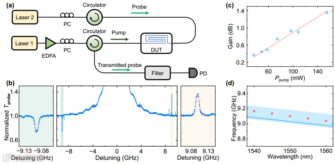 如图2所示,通过对行波光场和行波声场的横向强局域作用,研究人员在52mm长的波导结构中施加160mW的蓝失谐泵浦光可以让探测光产生1.4dB的增益。该性能还能够通过优化波导结构尺寸以及传输方向得到进一步的提升。国际上也在积极开展相应的研究,值得一提的是有两篇预印本论文(arXiv: 2311.14697, arXiv: 2311.18315)也报道了类似的实验结果。